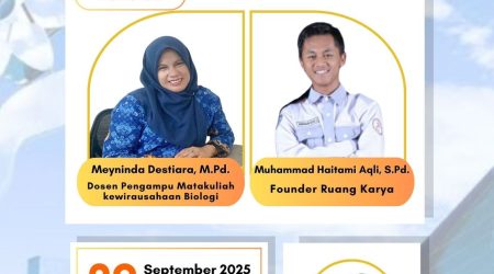 Kegiatan tersebut menghadirkan dua narasumber, yakni Meyninda Destiara, M.Pd. selaku dosen pengampu mata kuliah Kewirausahaan Biologi, serta Muhammad Haitami Aqli, S.Pd., Founder Ruang Karya. Bertindak sebagai moderator adalah Putri Nurhaliza. Acara dihadiri oleh dosen-dosen Tadris Biologi serta mahasiswa dari seluruh angkatan, yakni 2022, 2023, 2024, dan 2025.
