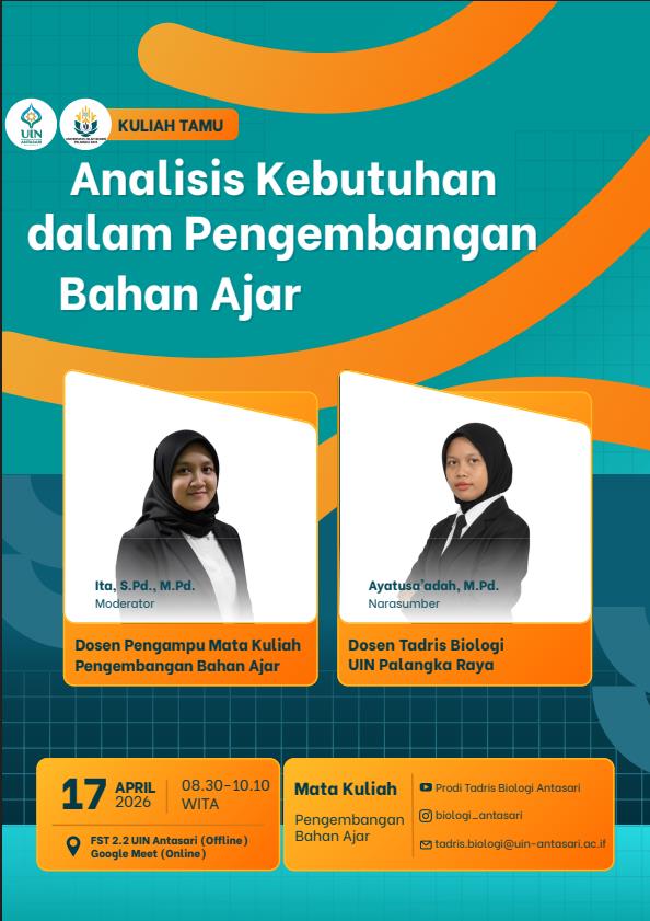 Banjarbaru, 17 April 2026 — Program Studi Tadris Biologi FTK UIN Antasari Banjarmasin kembali menghadirkan suasana akademik yang inspiratif melalui kegiatan kuliah tamu pada mata kuliah Pengembangan Bahan Ajar pada Jum’at 17 April 2026. Mengangkat tema “Analisis Kebutuhan dalam Pengembangan …